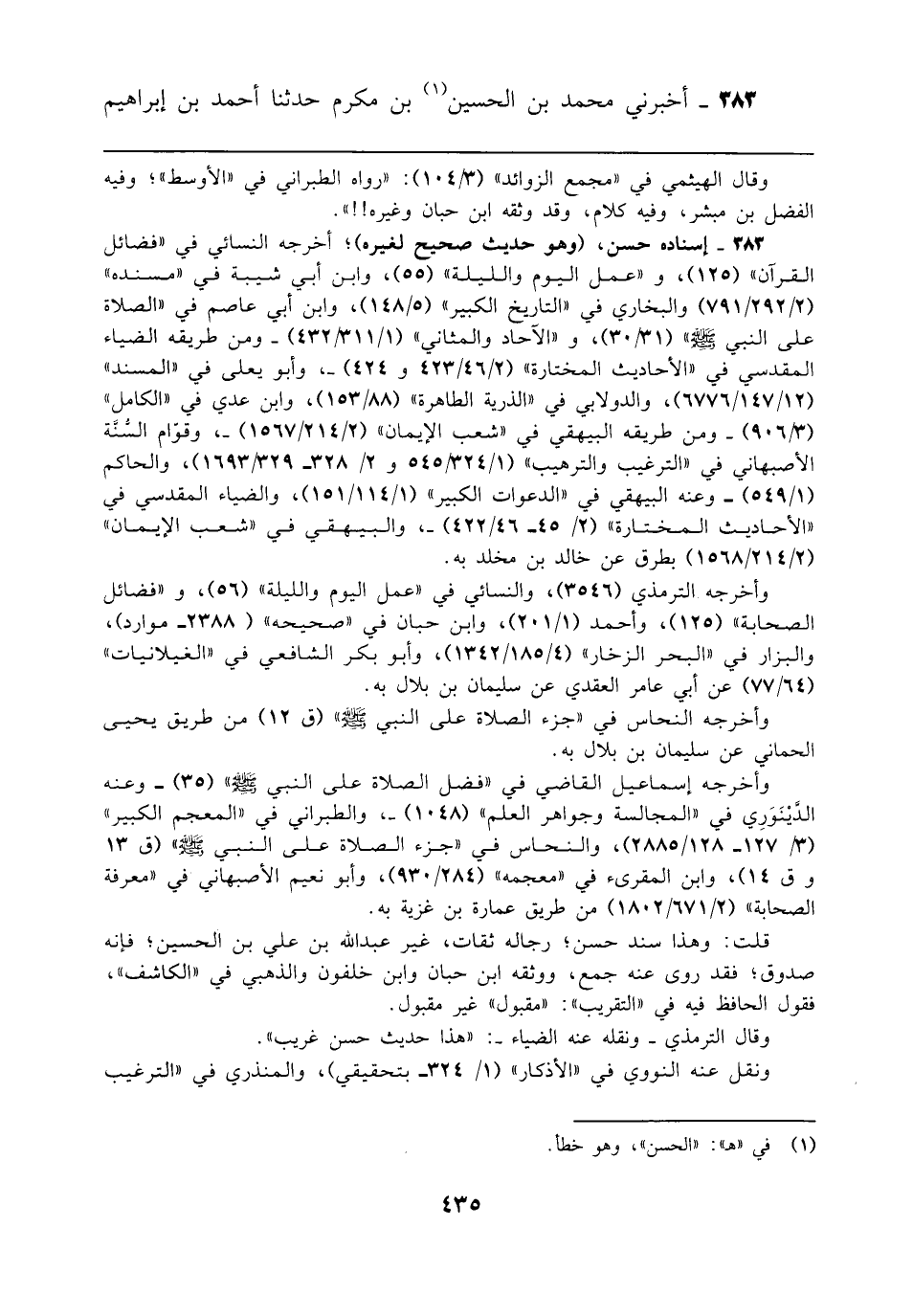 383 - إسناده حسن، (وهو حديث صحيح لغيره)؛ أخرجه النسائي في "فضائل القرآن" (125)، و"عمل اليوم والليلة" (55)، وابن أبي شيبة في "مسنده" (2/ 292/ 791) والبخاري في "التاريخ الكبير" (5/ 148)، وابن أبي عاصم في "الصلاة على النبي - صلى الله عليه وسلم - " (31/ 30)، و"الآحاد والمثاني" (1/ 311/ 432) -ومن طريقه الضياء المقدسي في "الأحاديث المختارة" (2/ 46/ 423 و 424) -, وأبو يعلى في "المسند" (12/ 147/ 6776)، والدولابي في "الذرية الطاهرة" (88/ 153)، وابن عدي في "الكامل" (3/ 906) -ومن طريقه البيهقي في "شعب الإيمان" (2/ 214/ 1567) -، وقوّام السنَّة الأصبهاني في "الترغيب والترهيب" (1/ 324/ 545 و 2/ 328 - 329/ 1693)، والحاكم (1/ 549) -وعنه البيهقي في "الدعوات الكبير" (1/ 114/ 151)، والضياء المقدسي في "الأحاديث المختارة" (2/ 45 - 46/ 422) -, والبيهقي في "شعب الإيمان" (2/ 214/ 1568) بطرق عن خالد بن مخلد به.