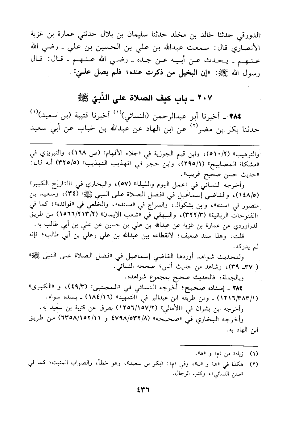 الدورقي حدثنا خالد بن مخلد حدثنا سليمان بن بلال حدثني عمارة بن غزية الأنصاري قال: سمعت عبد الله بن علي بن الحسين بن علي - رضي الله عنهم- يحدث عن أبيه عن جده - رضي الله عنهم- قال: قال رسول الله - صلى الله عليه وسلم -: "إن البخيل من ذكرت عنده؛ فلم يصل علي".