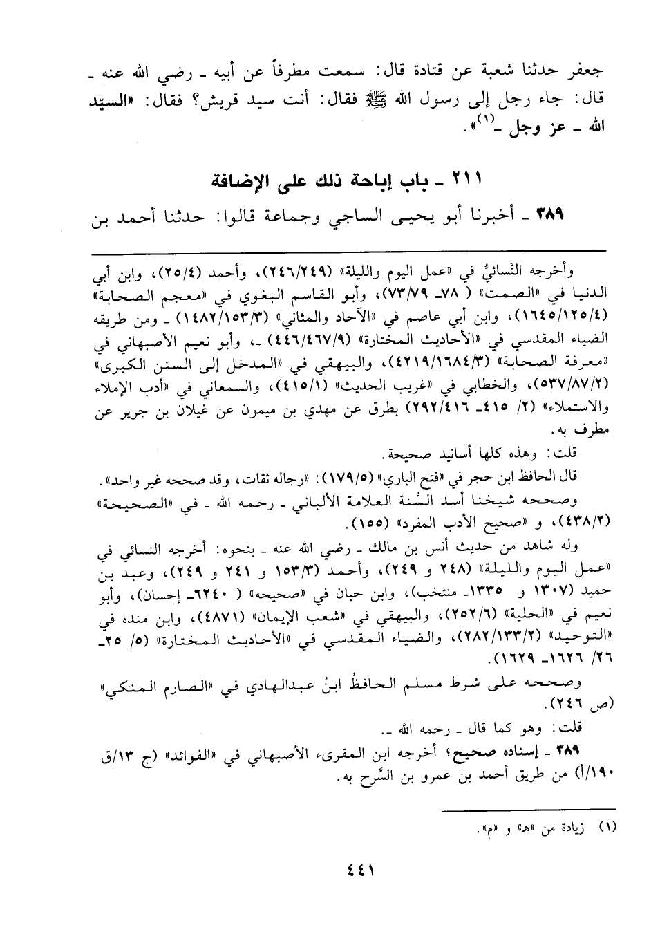 جعفر حدثنا شعبة عن قتادة قال: سمعت مطرفًا عن أبيه - رضي الله عنه - قال: جاء رجل إلى رسول الله - صلى الله عليه وسلم - فقال: أنت سيد قريش؛ فقال: "السيد الله - عَزَّ وَجَلَّ - (¬1) ".