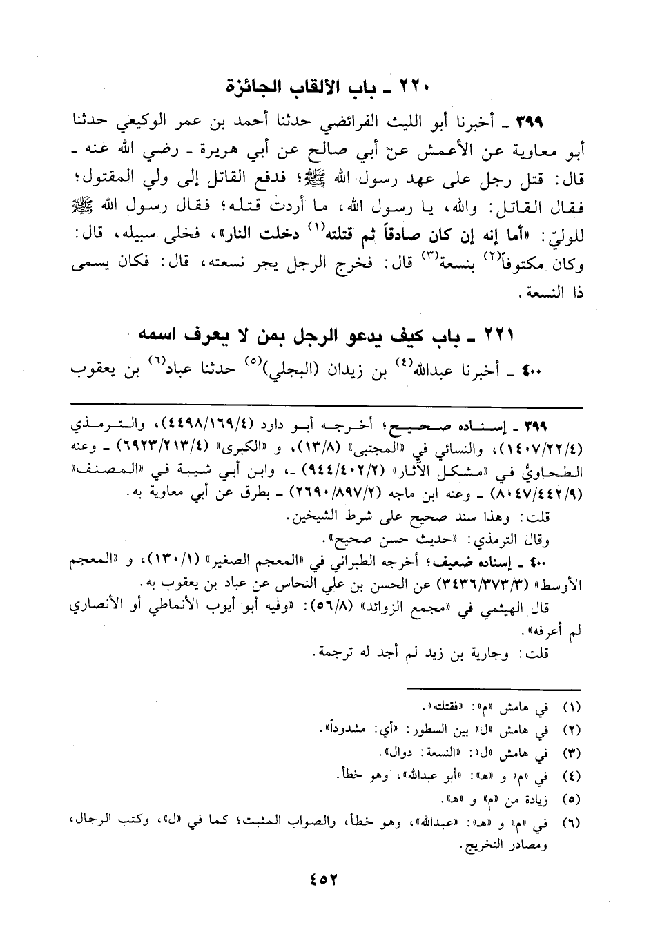 399 - إسناده صحيح؛ أخرجه أبو داود (4/ 169/ 4498)، والترمذي (4/ 22/ 1407)، والنسائي في "المجتبى" (8/ 13)، و"الكبرى" (4/ 213/ 6923) -وعنه الطحاويُّ في "مشكل الآثار" (2/ 402/ 944) -، وابن أبي شيبة في "المصنف" (9/ 442/ 8047) -وعنه ابن ماجه (2/ 897/ 2690) - بطرق عن أبي معاوية به.