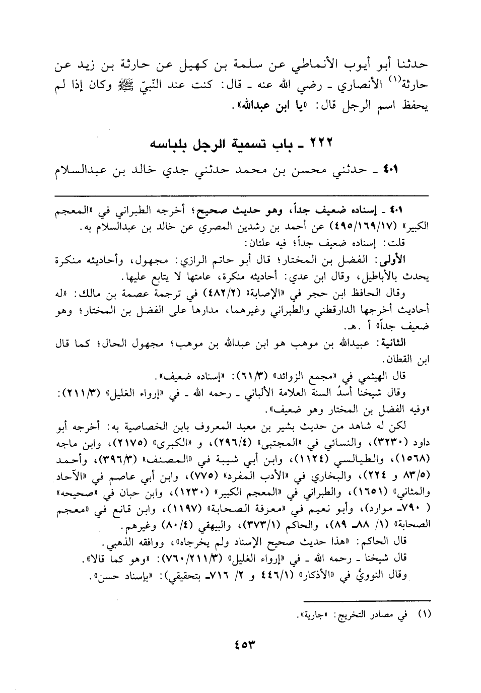 حدثنا أبو أيوب الأنماطي عن سلمة بن كهيل عن حارثة بن زيد عن حارثة (¬1) الأنصاري - رضي الله عنه - قال: كنت عند النبيّ - صلى الله عليه وسلم - وكان إذا لم يحفظ اسم الرجل قال: "يا ابن عبد الله".