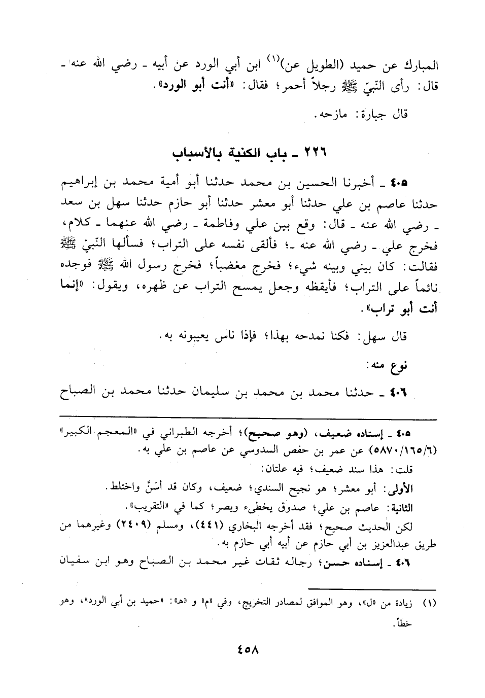 405 - أخبرنا الحسين بن محمد حدثنا أبو أمية محمد بن إبراهيم حدثنا عاصم بن علي حدثنا أبو معشر حدثنا أبو حازم حدثنا سهل بن سعد - رضي الله عنه - قال: وقع بين علي وفاطمة - رضي الله عنهما - كلام، فخرج علي - رضي الله عنه -؛ فألقى نفسه على التراب؛ فسألها النّبيّ - صلى الله عليه وسلم - فقالت: كان بيني وبينه شيء؛ فخرج مغضبًا؛ فخرج رسول الله - صلى الله عليه وسلم - فوجده نائمًا على التراب؛ فأيقظه وجعل يمسح التراب عن ظهره، ويقول: "إنما أنت أبو تراب".