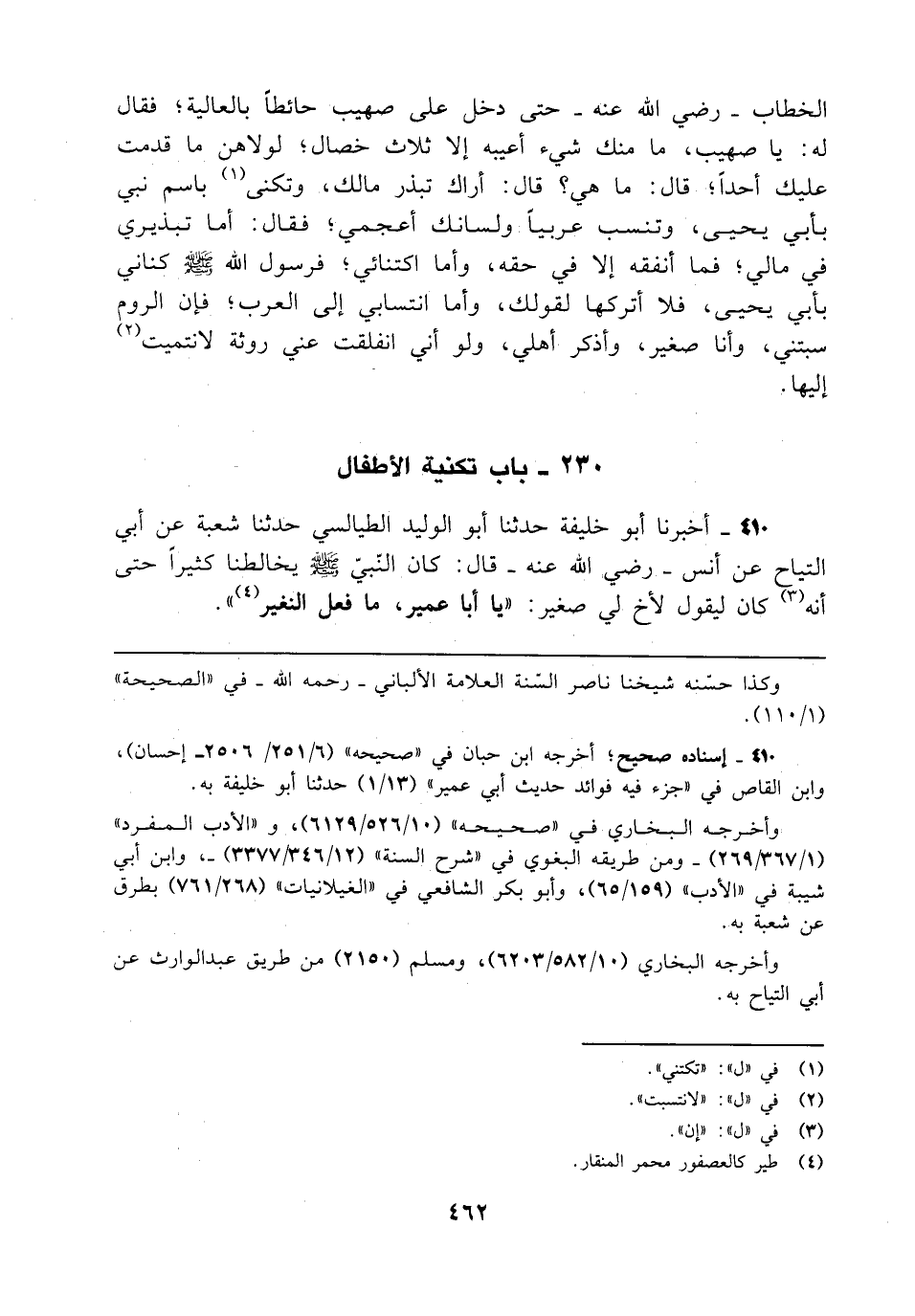 410 - أخبرنا أبو خليفة حدثنا أبو الوليد الطيالسي حدثنا شعبة عن أبي التياح عن أنس - رضي الله عنه - قال: كان النّبيّ - صلى الله عليه وسلم - يخالطنا كثيرًا حتى أنه (¬3) كان ليقول لأخ لي صغير: "يا أبا عمير، ما فعل النغير (¬4) ".