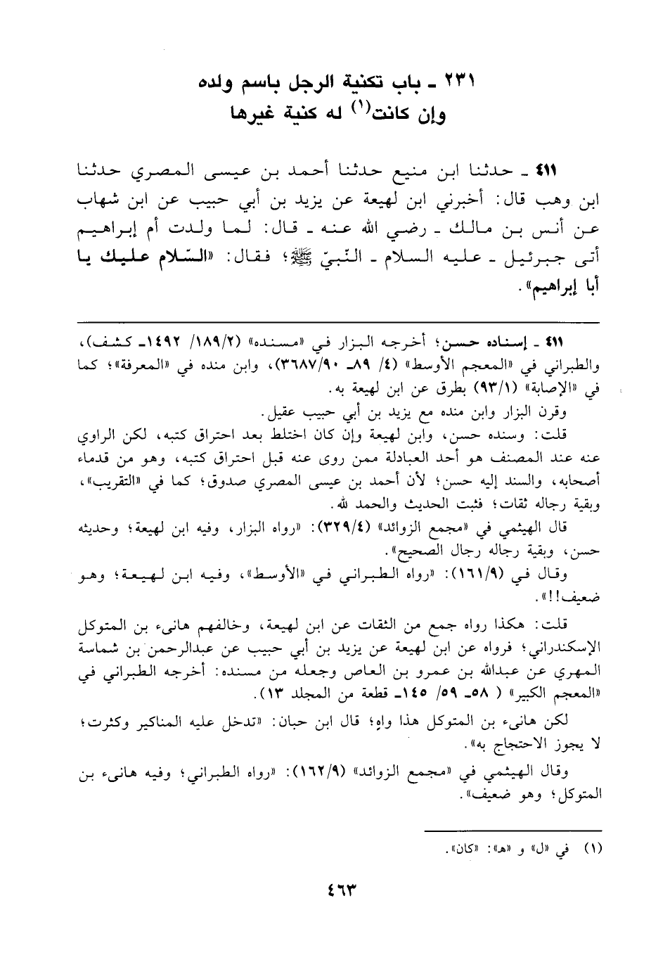 411 - حدثنا ابن منيع حدثنا أحمد بن عيسى المصري حدثنا ابن وهب قال: أخبرني ابن لهيعة عن يزيد بن أبي حبيب عن ابن شهاب عن أنس بن مالك - رضي الله عنه - قال: لما ولدت أم إبراهيم أتى جبرئيل -عليه السلام - النّبي - صلى الله عليه وسلم -؛ فقال: "السّلام عليك يا أبا إبراهيم".