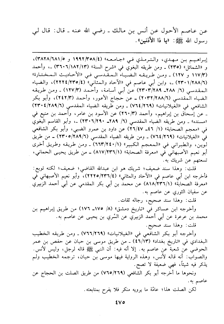 عن عاصم الأحول عن أنس بن مالك - رضي الله عنه - قال: قال لي رسول الله - صلى الله عليه وسلم -: "يا ذا الأذنين".