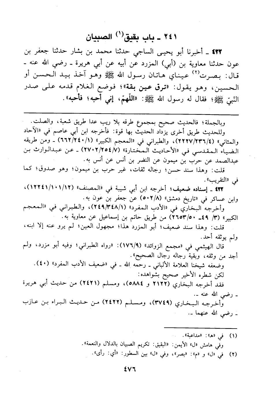 422 - أخبرنا أبو يحيى الساجي حدثنا محمد بن بشار حدثنا جعفر بن عون حدثنا معاوية بن (أبي) المزرد عن أبيه عن أبي هريرة - رضي الله عنه - قال: بصرت (¬2) عيناي هاتان رسول الله - صلى الله عليه وسلم - وهو آخذ بيد الحسن أو الحسين، وهو يقول: "ترق عين بقة"؛ فوضع الغلام قدمه على صدر النّبيّ - صلى الله عليه وسلم - فقال له رسول الله - صلى الله عليه وسلم -: "اللهمّ، إني أحبه؛ فأحبه".