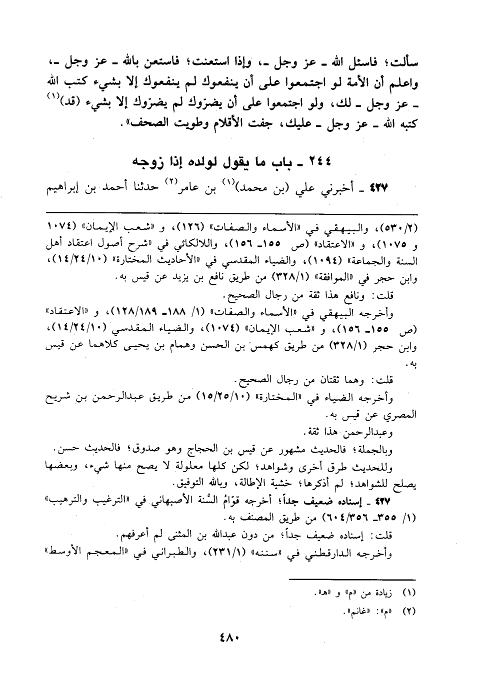 سألت؛ فاسئل الله - عز وجل -، وإذا استعنت؛ فاستعن بالله - عز وجل -، واعلم أن الأمة لو اجتمعوا على أن ينفعوك لم ينفعوك إلا بشيء كتب الله - عز وجل - لك، ولو اجتمعوا على أن يضرّوك لم يضرّوك إلا بشيء (قد) (¬1) كتبه الله - عز وجل - عليك، جفت الأقلام وطويت الصحف".