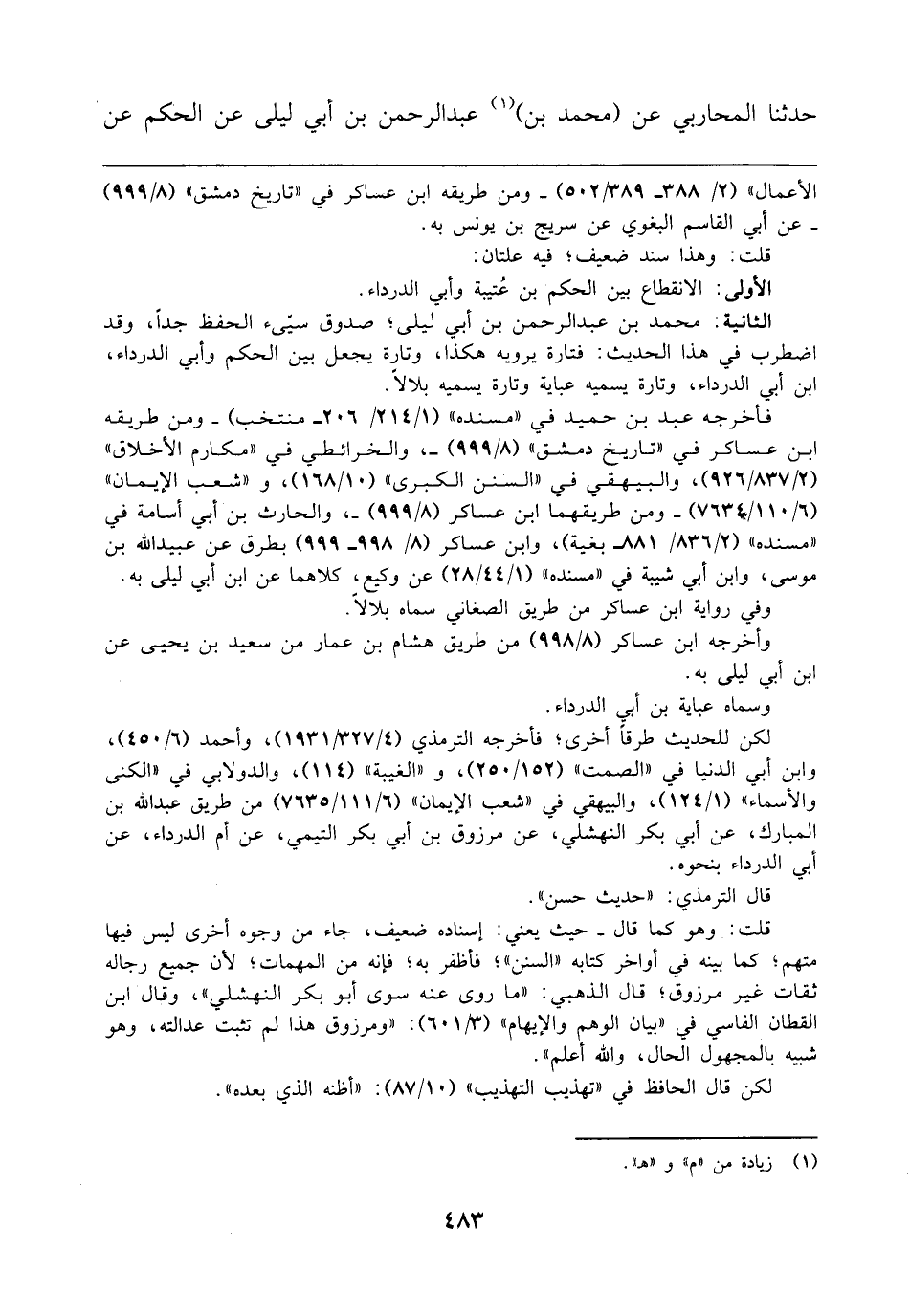 الثانية: محمد بن عبد الرحمن بن أبي ليلى؛ صدوق سيىء الحفظ جدًا، وقد اضطرب في هذا الحديث: فتارة يرويه هكذا، وتارة يجعل بين الحكم وأبي الدرداء، ابن أبي الدرداء، وتارة يسميه عباية وتارة يسميه بلالًا.