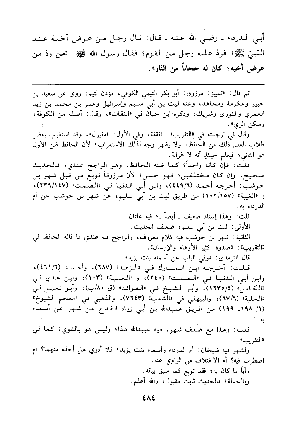 قلت: فإن كانا واحدًا؛ كما ظنه الحافظ، وهو الراجح عندي؛ فالحديث صحيح، وإن كان مختلفين؛ فهو حسن؛ لأن مرزوقًا توبع من قبل شهر بن حوشب: أخرجه أحمد (6/ 449)، وابن أبي الدنيا في "الصمت" (147/ 239)، و"الغيبة" (157/ 102) من طريق ليث بن أبي سليم، عن شهر بن حوشب عن أم الدرداء به.