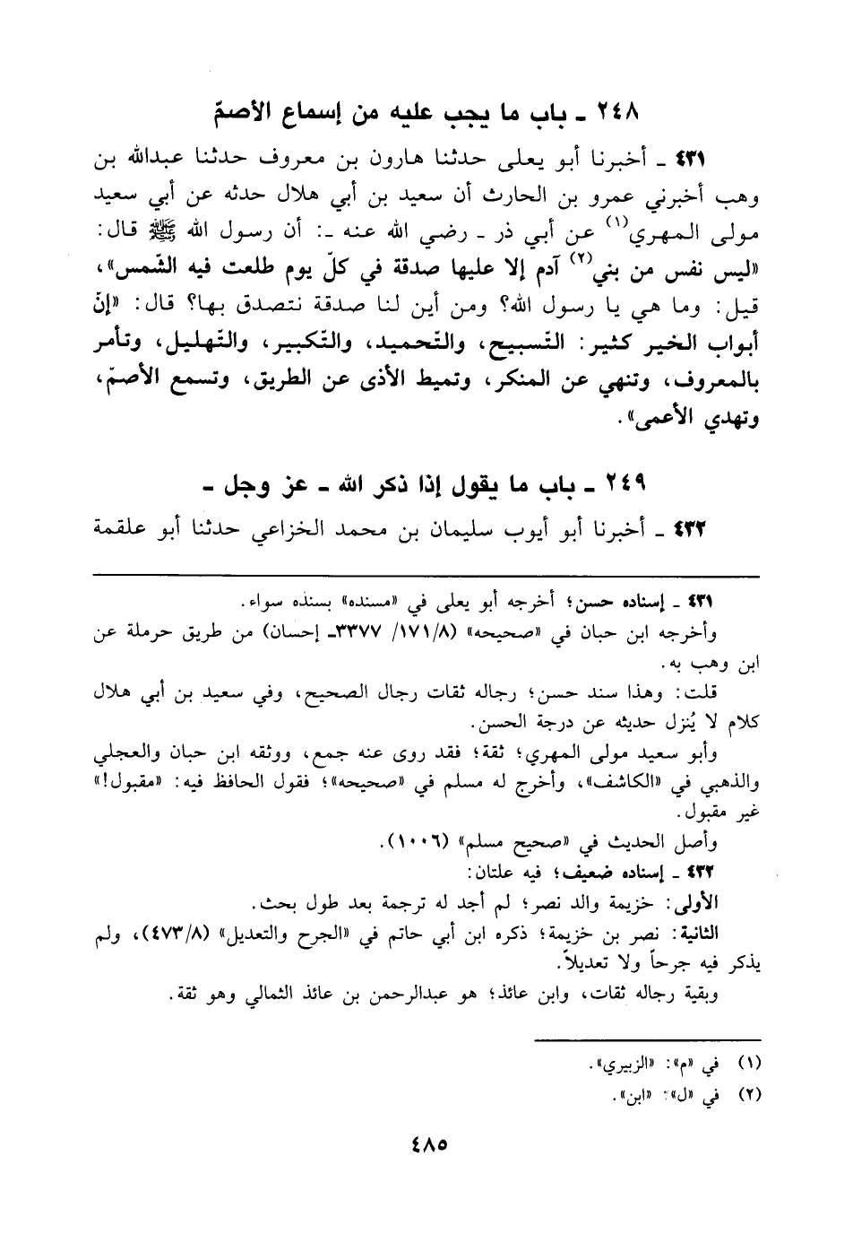 431 - أخبرنا أبو يعلى حدثنا هارون بن معروف حدثنا عبد الله بن وهب أخبرني عمرو بن الحارث أن سعيد بن أبي هلال حدثه عن أبي سعيد مولى المهري (¬1) عن أبي ذر - رضي الله عنه -: أن رسول الله - صلى الله عليه وسلم - قال: "ليس نفس من بني (¬2) آدم إلا عليها صدقة في كلّ يوم طلعت فيه الشمس"، قيل: وما هي يا رسول الله؟ ومن أين لنا صدقة نتصدق بها؟ قال: "إنّ أبواب الخير كثير: التسبيح، والتحميد، والتكبير، والتهليل، وتأمر بالمعروف، وتنهي عن المنكر، وتميط الأذى عن الطريق، وتسمع الأصمّ، وتهدي الأعمى".