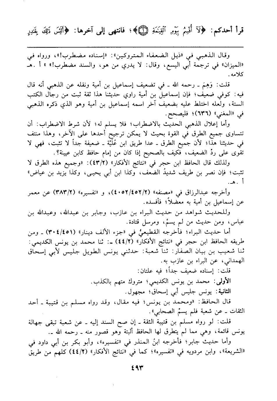 وأما إعلال الذهبي الحديث بالاضطراب، فلا يسلم له؛ لأن شرط الاضطراب: أن تتساوى جميع الطرق في القوة بحيث لا يمكن ترجيح أحدها على الآخر، وهذا منتف في حديثنا هذا؛ لأن جميع الطرق -عدا طريق ابن عُلَيَّة- ضعيفة جدًا لا تثبت، فهي لا تقوى على ردِّ الضعيف، فكيف بالصحيح إذا كان من إمام حافظ كابن عيينة؟.