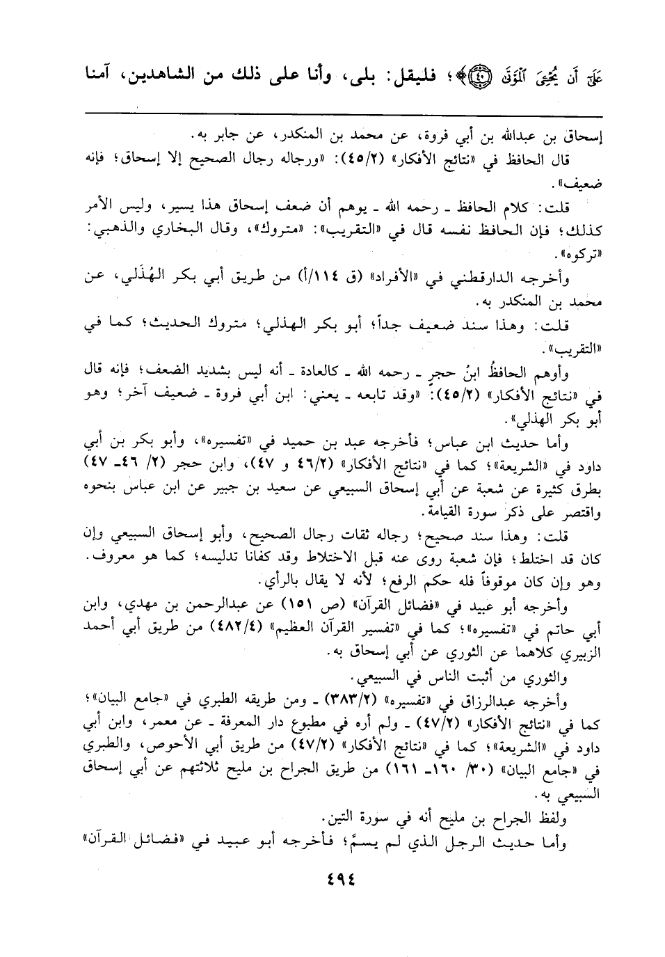 وأما حديث ابن عباس؛ فأخرجه عبد بن حميد في "تفسيره"، وأبو بكر بن أبي داود في "الشريعة"؛ كما في "نتائج الأفكار" (2/ 46 و 47)، وابن حجر (2/ 46 - 47) بطرق كثيرة عن شعبة عن أبي إسحاق السبيعي عن سعيد بن جبير عن ابن عباس بنحوه واقتصر على ذكر سورة القيامة.