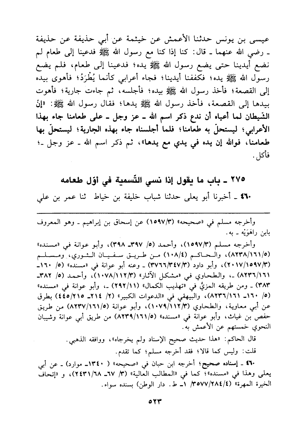 عيسى بن يونس حدثنا الأعمش عن خيثمة عن أبي حذيفة عن حذيفة - رضي الله عنهما - قال: كنا إذا كنا مع رسول الله - صلى الله عليه وسلم - فدعينا إلى طعام لم نضع أيدينا حتى يضع رسول الله - صلى الله عليه وسلم - يده؛ فدعينا إلى طعام، فلم يضع رسول الله - صلى الله عليه وسلم - يده، فكففنا أيديناة فجاء أعرابي كأنما يُطْرَدُ؛ فأهوى بيده إلى القصعة؛ فأخذ رسول الله - صلى الله عليه وسلم - بيده؛ فأجلسه، ثم جاءت جارية؛ فأهوت بيدها إلى القصعة، فأخذ رسول الله - صلى الله عليه وسلم - يدها؛ فقال رسول الله - صلى الله عليه وسلم -: "إن الشّيطان لما أعياه أن ندع ذكر اسم الله - عَزَّ وَجَلَّ - على طعامنا جاء بهذا الأعرابي؛ ليستحلّ به طعامنا؛ فلما أجلسناه جاء بهذه الجارية؛ ليستحلّ بها طعامنا، فوالله إن يده في يدي مع يدها"، ثم ذكر اسم الله - عَزَّ وَجَلَّ -؛ فأكل.