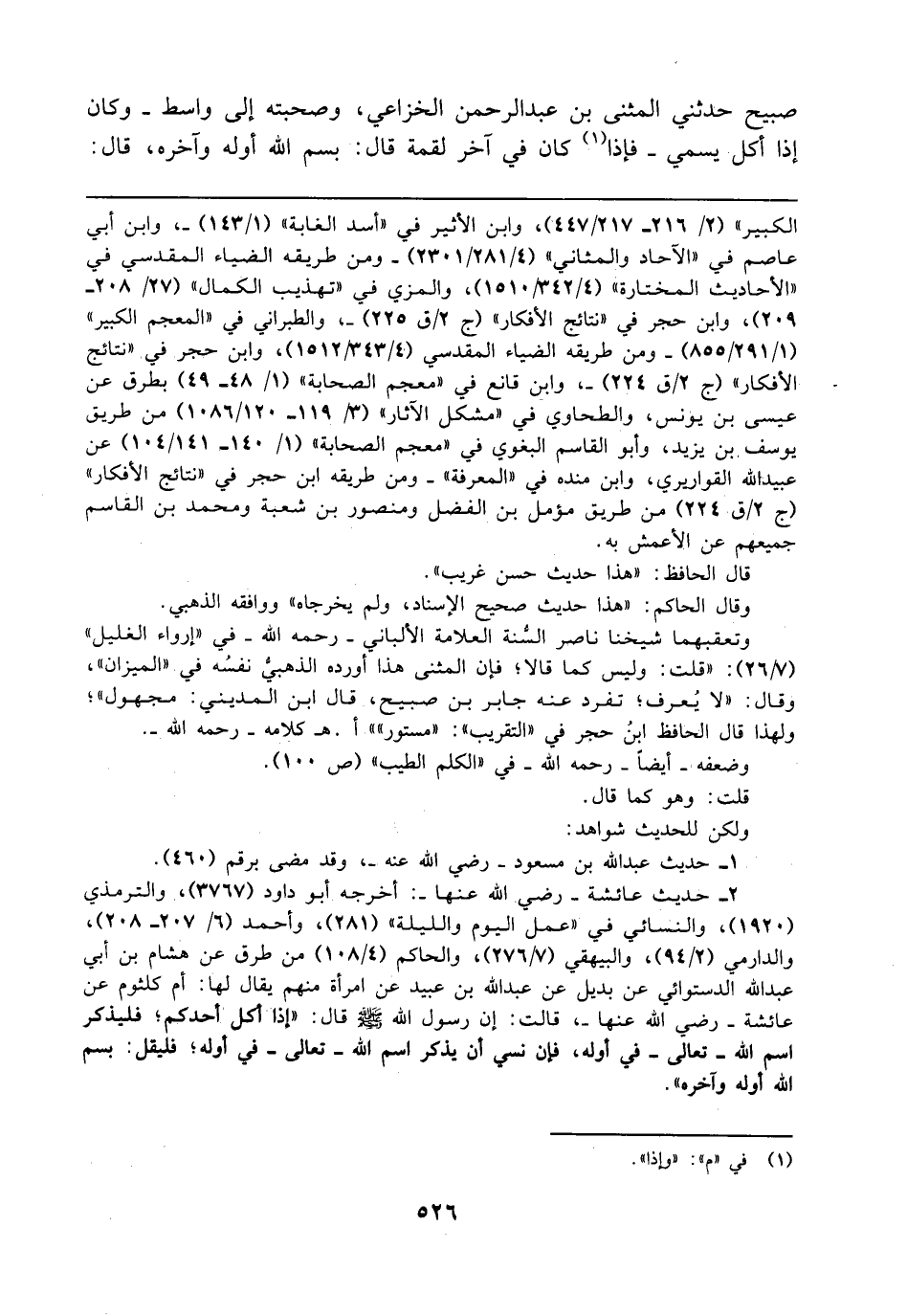 2 - حديث عائشة - رضي- الله عنها -: أخرجه أبو داود (3767)، والترمذي (1920)، والنسائي في "عمل اليوم والليلة" (281)، وأحمد (6/ 207 - 208)، والدارمي (2/ 94)، والبيهقي (7/ 276)، والحاكم (4/ 108) من طرق عن هشام بن أبي عبد الله الدستوائي عن بديل عن عبد الله بن عبيد عن امرأة منهم يقال لها: أم كلثوم عن عائشة - رضي الله عنها -، قالت: إن رسول الله - صلى الله عليه وسلم - قال: "إذا كل أحدكم؛ فليذكر اسم الله -تعالى- في أوله، فإن نسي أن يذكر اسم الله -تعالى- في أوله؛ فليقل: بسم الله أوله وآخره".