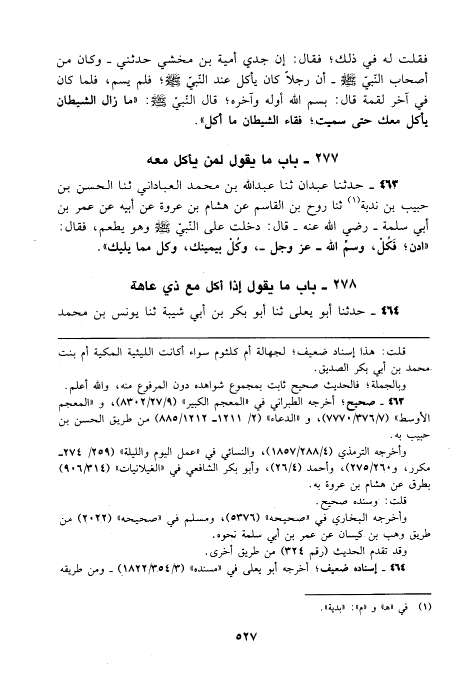 فقلت له في ذلك؛ فقال: إن جدي أمية بن مخشي حدثني -وكان من أصحاب النّبيّ (صلى الله عليه وسلم) - أن رجلًا كان يأكل عند النّبيّ - صلى الله عليه وسلم - فلم يسم، فلما كان في آخر لقمة قال: بسم الله أوله وآخره؛ قال النّبيّ - صلى الله عليه وسلم -: "ما زال الشيطان يأكل معك حتى سميت،؛ فقاء الشيطان ما أكل".