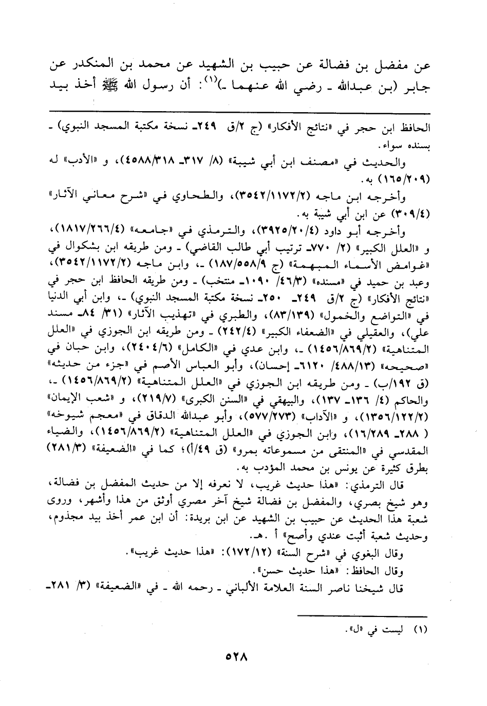 عن مفضل بن فضالة عن حبيب بن الشهيد عن محمد بن المنكدر عن جابر (بن عبد الله - رضي الله عنهما -) (¬1): أن رسول الله - صلى الله عليه وسلم - أخذ بيد