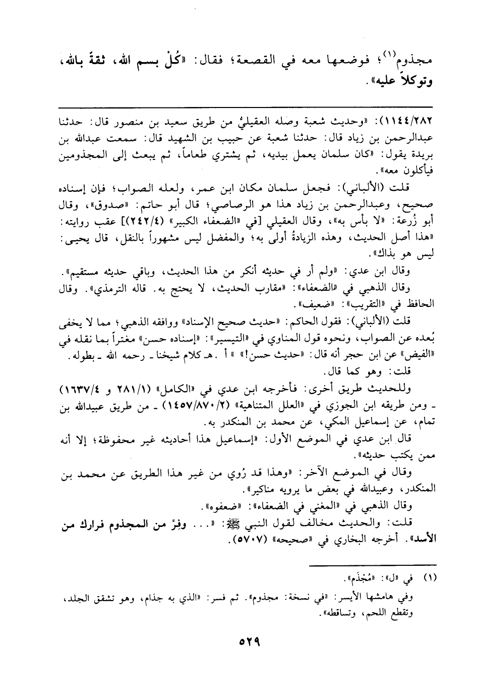 282/ 1144): "وحديث شعبة وصله العقيليُّ من طريق سعيد بن منصور قال: حدثنا عبد الرحمن بن زياد قال: حدثنا شعبة عن حبيب بن الشهيد قال: سمعت عبد الله بن بريدة يقول: "كان سلمان يعمل بيديه، ثم يشتري طعامًا، ثم يبعث إلى المجذومين فيأكلون معه".