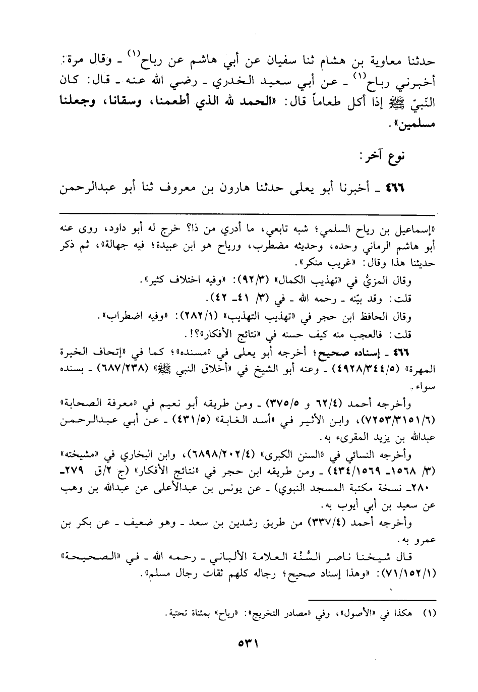 حدثنا معاوية بن هشام ثنا سفيان عن أبي هاشم عن رباح (¬1) -وقال مرة: أخبرني رباح (1) - عن أبي سعيد الخدري - رضي الله عنه - قال: كان النّبيّ - صلى الله عليه وسلم - إذا أكل طعامًا قال: "الحمد لله الذي أطعمنا، وسقانا، وجعلنا مسلمين".