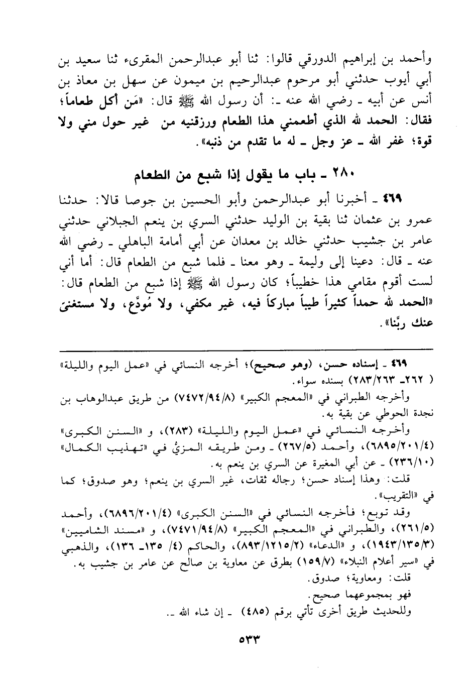 469 - أخبرنا أبو عبد الرحمن وأبو الحسين بن جوصا قالا: حدثنا عمرو بن عثمان ثنا بقية بن الوليد حدثني السري بن ينعم الجبلاني حدثني عامر بن جشيب حدثني خالد بن معدان عن أبي أمامة الباهلي - رضي الله عنه - قال؛ دعينا إلى وليمة -وهو معنا- فلما شبع من الطعام قال: أما أني لست أقوم مقامي هذا خطيبًا، كان رسول الله - صلى الله عليه وسلم - إذا شبع من الطعام قال: "الحمد لله حمدًا كثيرًا طيبًا مباركًا فيه، غير مكفي، ولا مُودَّع، ولا مستغنىً عنك ربَّنا".