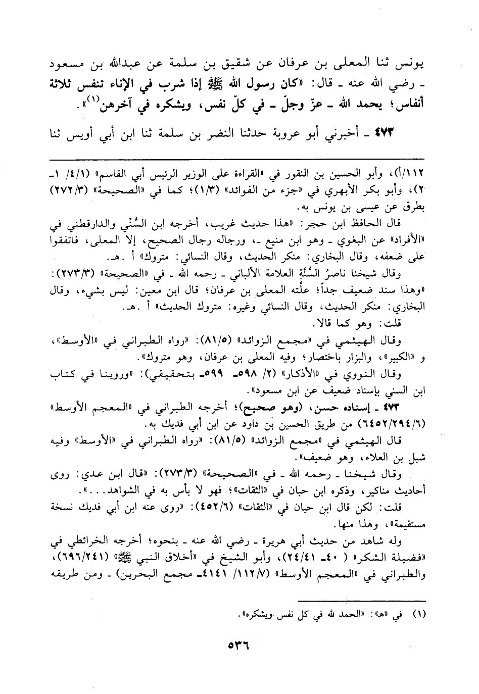 يونس ثنا المعلي بن عرفان عن شقيق بن سلمة عن عبد الله بن مسعود - رضي الله عنه - قال: "كان رسول الله - صلى الله عليه وسلم - إذا شرب في الإناء تنفس ثلاثة أنفاس؛ يحمد الله - عَزَّ وَجَلَّ - في كلّ نفس، ويشكره في آخرهن (¬1) ".