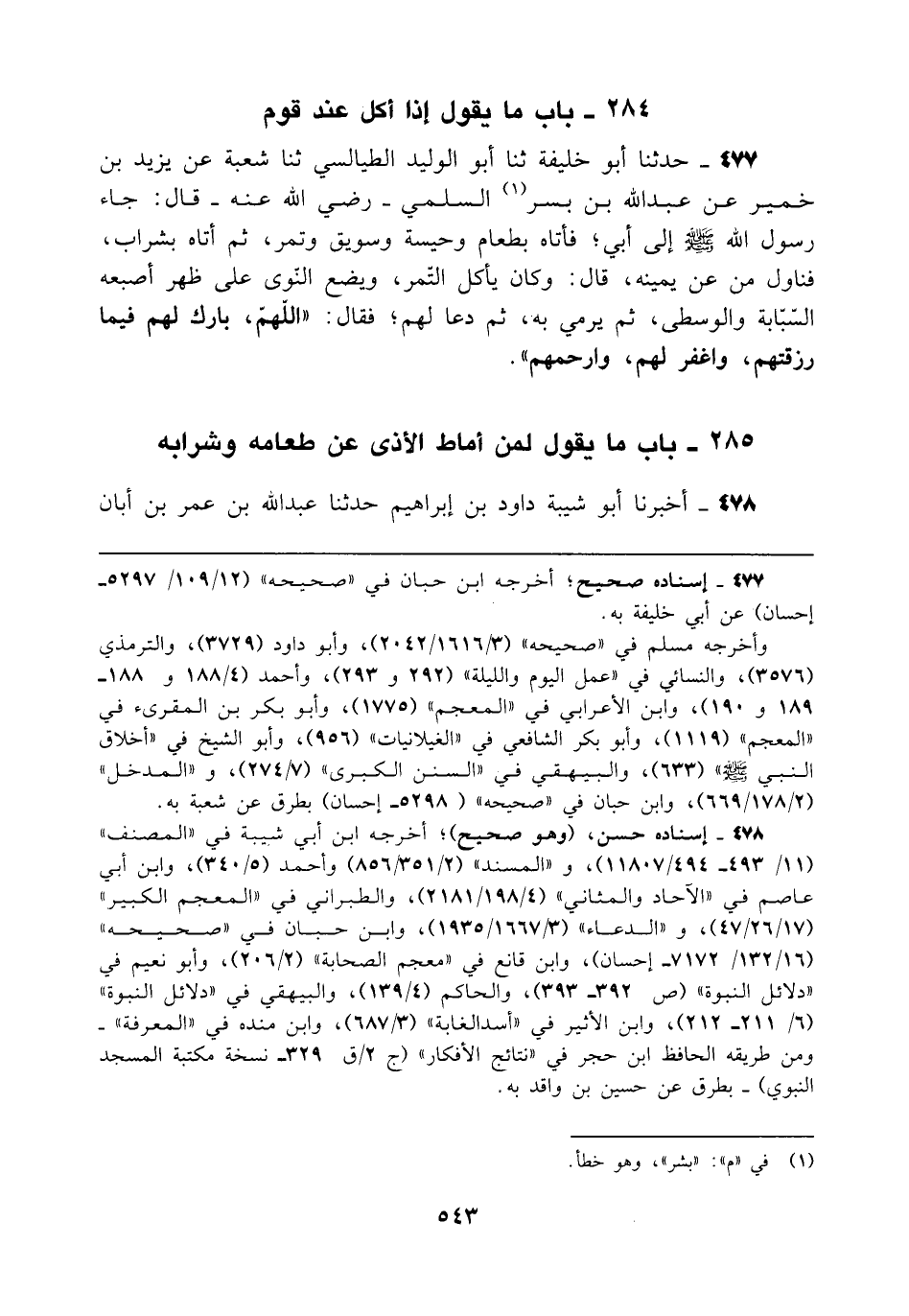 477 - حدثنا أبو خليفة ثنا أبو الوليد الطيالسي ثنا شعبة عن يزيد بن خمير عن عبد الله بن بسر (¬1) السلمي - رضي الله عنه - قال: جاء رسول الله - صلى الله عليه وسلم - إلى أبي، فأتاه بطعام وحيسة وسويق وتمر، ثم أتاه بشراب، فناول من عن يمينه، قال: وكان يأكل التمر، ويضع النّوى على ظهر أصبعه السّبّابة والوسطى، ثم يرمي به، ثم دعا لهم؛ فقال: "اللهمّ، بارك لهم فيما رزقتهم، واغفر لهم، وارحمهم".