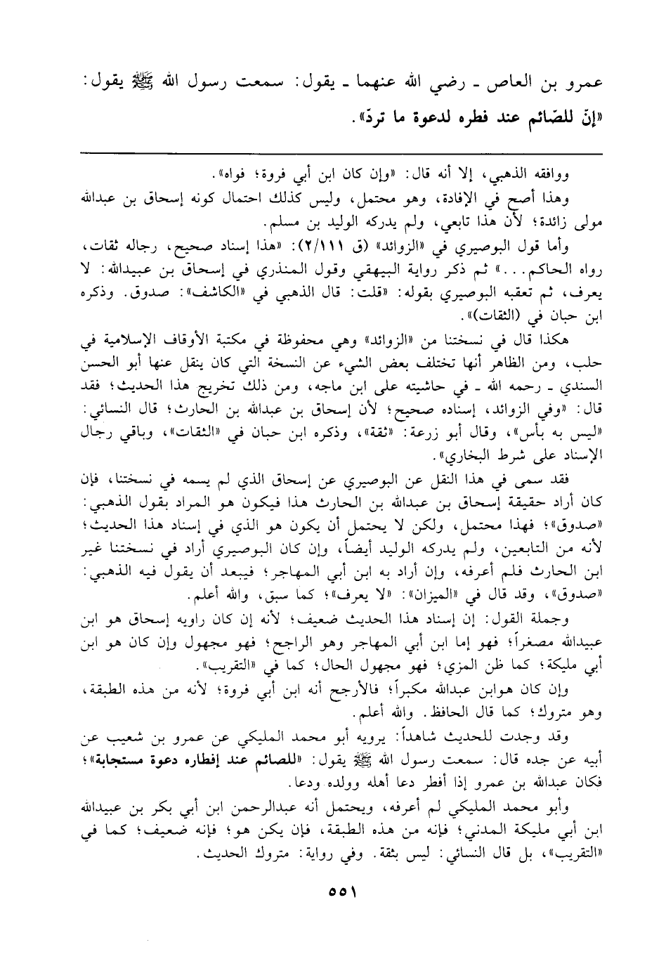 فقد سمى في هذا النقل عن البوصيري عن إسحاق الذي لم يسمه في نسختنا، فإن كان أراد حقيقة إسحاق بن عبد الله بن الحارث هذا فيكون هو المراد بقول الذهبي: "صدوق"؛ فهذا محتمل، ولكن لا يحتمل أن يكون هو الذي في إسناد هذا الحديث، لأنه من التابعين، ولم يدركه الوليد أيضًا، وإن كان البوصيري أراد في نسختنا غير ابن الحارث فلم أعرفه، وإن أراد به ابن أبي المهاجر؛ فيبعد أن يقول فيه الذهبي: "صدوق"، وقد قال في "الميزان": "لا يعرف"؛ كما سبق، والله أعلم.