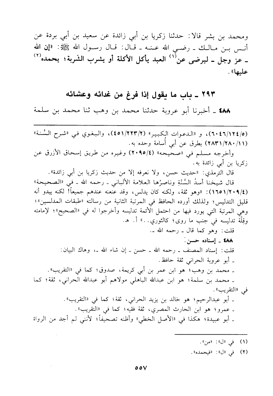 ومحمد بن بشر قالا: حدثنا زكريا بن أبي زائدة عن سعيد بن أبي بردة عن أنس بن مالك - رضي الله عنه - قال: قال رسول الله - صلى الله عليه وسلم -: "إن الله - عَزَّ وَجَلَّ - ليرضى عن (¬1) العبد يأكل الأكلة أو يشرب الشّربة؛ يحمده (¬2) عليها".