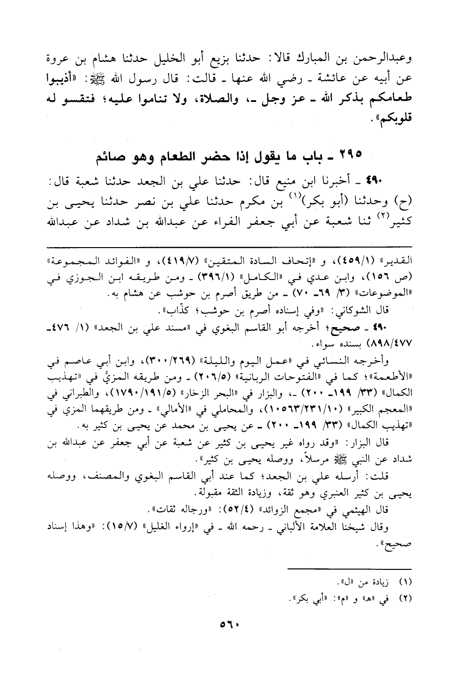 490 - أخبرنا ابن منيع قال: حدثنا علي بن الجعد حدثنا شعبة قال: (ح) وحدثنا (أبو بكر) (¬1) بن مكرم حدثنا علي بن نصر حدثنا يحيى بن كثير (¬2) ثنا شعبة عن أبي جعفر الفراء عن عبد الله بن شداد عن عبد الله