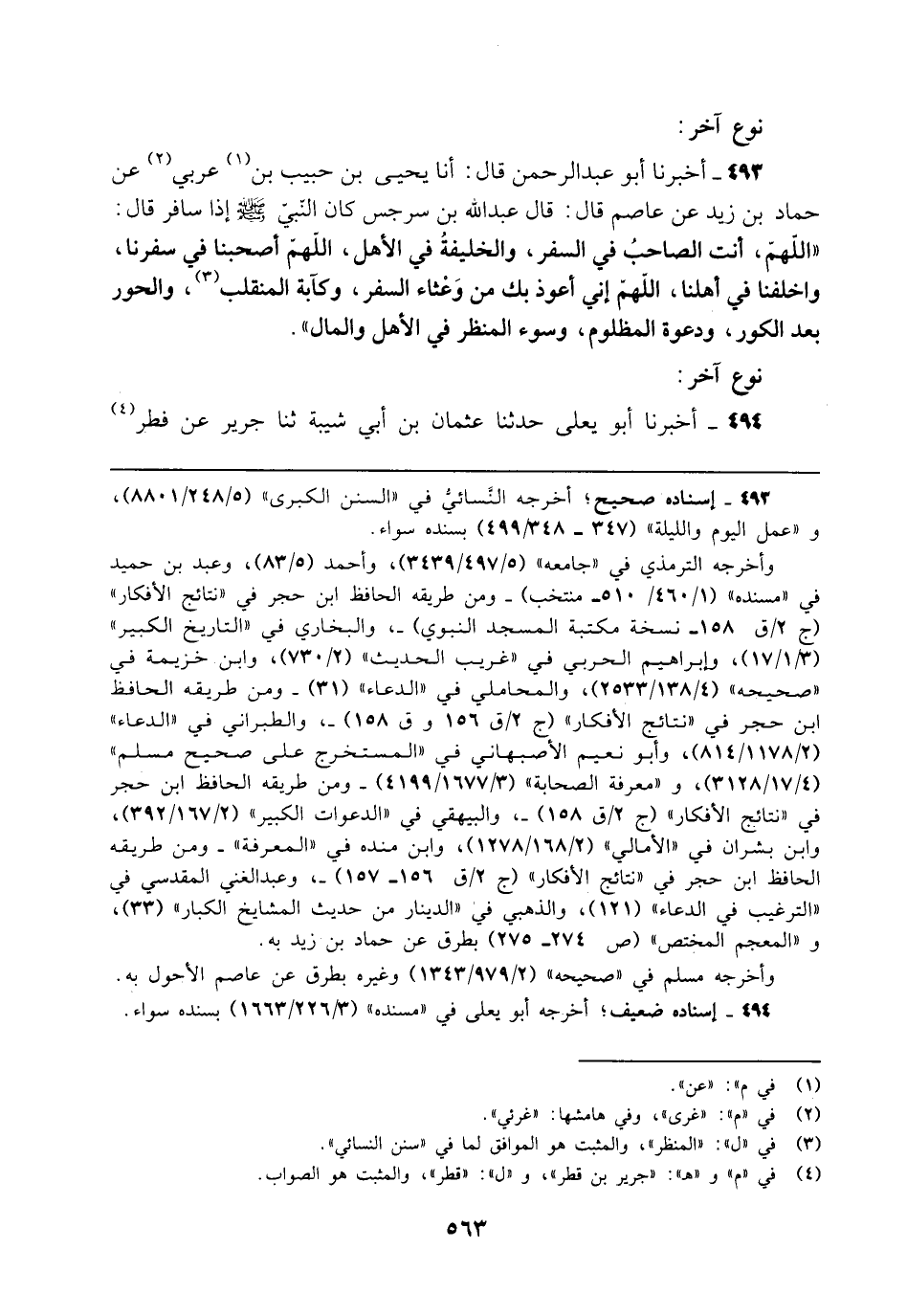 493 - أخبرنا أبو عبد الرحمن قال: أنا يحيى بن حبيب بن (¬1) عربي (¬2) عن حماد بن زيد عن عاصم قال: قال عبد الله بن سرجس كان النّبي - صلى الله عليه وسلم - إذا سافر قال: "اللهمّ، أنت الصاحبُ في السفر، والخليفةُ في الأهل، اللهم أصحبنا في سفرنا، واخلفنا في أهلنا، اللهم إني أعوذ بك من وَعْثاء السفر، وكآبة المنقلب (¬3)، والحور بعد الكور، ودعوة المظلوم، وسوء المنظر في الأهل والمال".