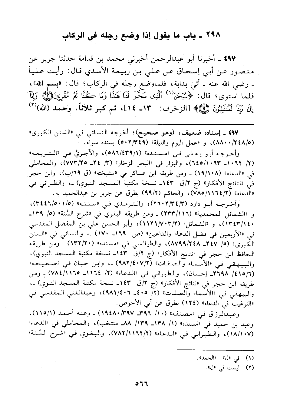 497 - أخبرنا أبو عبد الرحمن أخبرني محمَّد بن قدامة حدثنا جرير عن منصور عن أبي إسحاق عن علي بن ربيعة الأسدي قال: رأيت عليًا - رضي الله عنه - أتي بدابة، فلما وضع رجله في الركاب؛ قال: "بسم الله"، فلما استوى؛ قال: {سُبْحَانَ (¬1) الَّذِي سَخَّرَ لَنَا هَذَا وَمَا كُنَّا لَهُ مُقْرِنِينَ (13) وَإِنَّا إِلَى رَبِّنَا لَمُنْقَلِبُونَ (14)} [الزخرف:13 - 14]، ثم كبر ثلاثًا، وحمد (الله) (¬2)