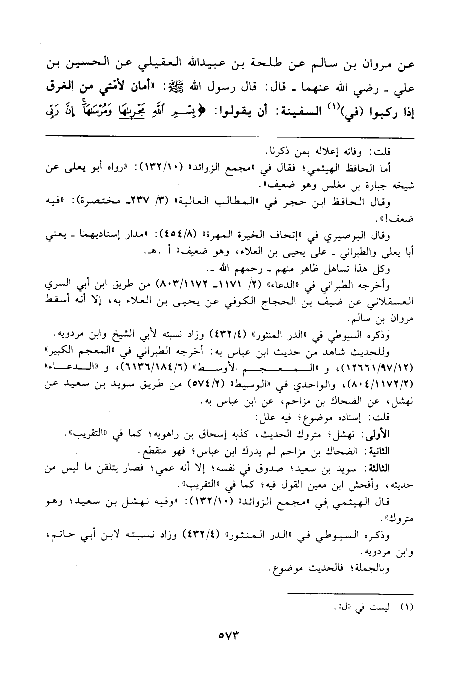 عن مروان بن سالم عن طلحة بن عبيد الله العقيلي عن الحسين بن علي - رضي الله عنهما - قال: قال رسول الله - صلى الله عليه وسلم -: "أمان لأمتي من الغرق إذا ركبوا (في) (¬1) السفينة: أن يقولوا: {بِسْمِ اللَّهِ مَجْرَاهَا وَمُرْسَاهَا إِنَّ رَبِّي