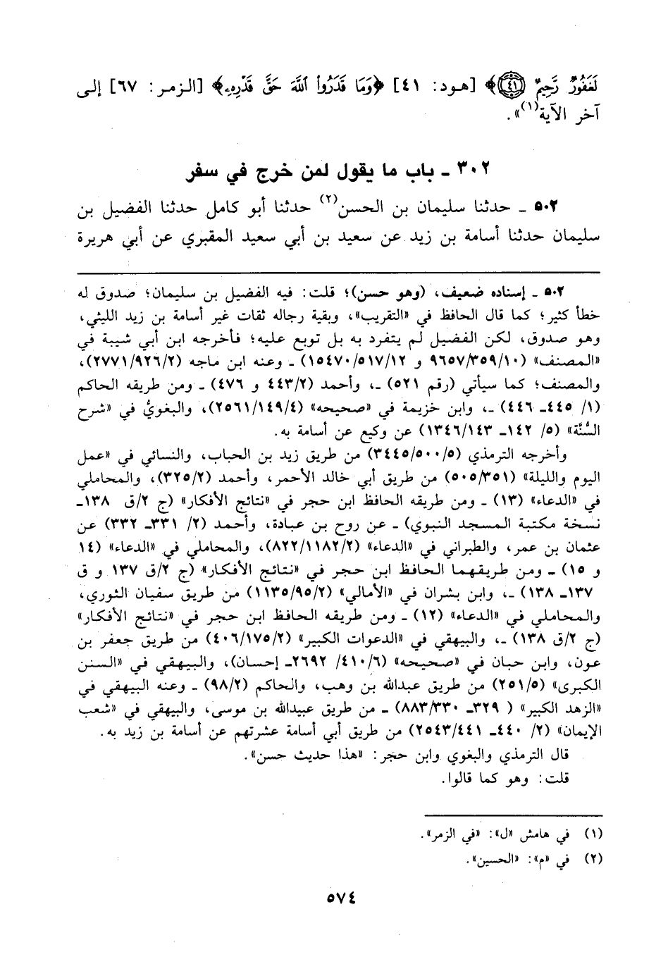 وأخرجه الترمذي (5/ 500/ 3445) من طريق زيد بن الحباب، والنسائي في "عمل اليوم والليلة" (351/ 505) من طريق أبي خالد الأحمر، وأحمد (2/ 325)، والمحاملي في "الدعاء" (13) -ومن طريقه الحافظ ابن حجر في "نتائج الأفكار" (ج 2/ ق 138 - نسخة مكتبة المسجد النبوي) - عن روح بن عبادة، وأحمد (2/ 331 - 332) عن عثمان بن عمر، والطبراني في "الدعاء" (2/ 1182/ 822)، والمحاملي في "الدعاء" (14 و 15) -ومن طريقهما الحافظ ابن حجر في "نتائج الأفكار"، (ج 2/ ق 137 وق 137 - 138) -، وابن بشران في "الأمالي" (2/ 95/ 1135) من طريق سفيان الثوري، والمحاملي في "الدعاء" (12) -ومن طريقه الحافظ ابن حجر في "نتائج الأفكار" (ج 2 /ق 138) -، والبيهقي في "الدعوات الكبير" (2/ 175/ 406) من طريق جعفر بن عون، وابن حبان في "صحيحه" (6/ 410/ 2692 - إحسان)، والبيهقي في "السنن الكبرى" (5/ 251) من طريق عبد الله بن وهب، والحاكم (2/ 98) -وعنه البيهقي في "الزهد الكبير" (329 - 330/ 883) - من طريق عبيد الله بن موسى، والبيهقي في "شعب الإيمان" (2/ 440 - 441/ 2543) من طريق أبي أسامة عشرتهم عن أسامة بن زيد به.