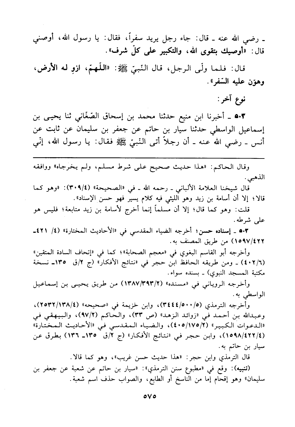 503 - أخبرنا ابن منيع حدثنا محمَّد بن إسحاق الصّغّاني ثنا يحيى بن إسماعيل الواسطي حدثنا سيار بن حاتم عن جعفر بن سليمان عن ثابت عن أنس - رضي الله عنه - أن رجلًا أتى النّبيّ - صلى الله عليه وسلم - فقال: يا رسول الله، إنّي