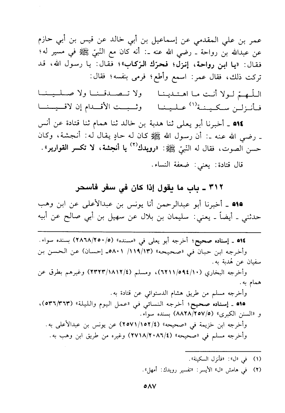 514 - أخبرنا أبو يعلى ثنا هدبة بن خالد ثنا همام ثنا قتادة عن أنس - رضي الله عنه -: أن رسول الله - صلى الله عليه وسلم - كان له حادٍ يقال له: أنجشة، وكان حسن الصوت، فقال له النبي - صلى الله عليه وسلم -: "رويدك (¬2) يا أنجشة، لا تكسر القوارير".