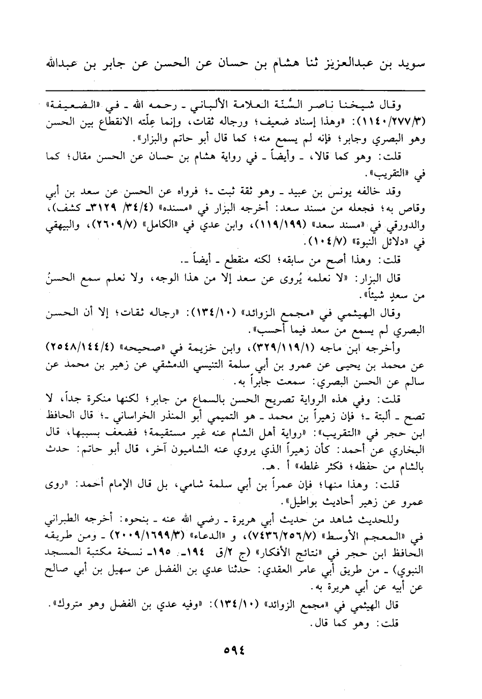 وقال شيخنا ناصر السُّنّة العلامة الألباني - رحمه الله - في "الضعيفة" (3/ 277/1140): "وهذا إسناد ضعيف؛ ورجاله ثقات، وإنما عِلّته الانقطاع بين الحسن وهو البصري وجابر؛ فإنه لم يسمع منه؛ كما قال أبو حاتم والبزار".