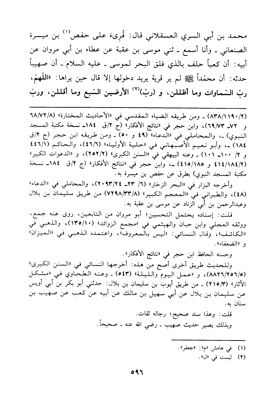 محمَّد بن أبي السري العسقلاني قال: قُرِىءَ على حفص (¬1) بن ميسرة الصنعاني -وأنا أسمع- ثني موسى بن عقبة عن عطاء بن أبي مروان عن أبيه: أن كعبًا حلف بالذي فلق البحر لموسى - عليه السلام - أن صهيبًا حدثه: أن محمّدًا - صلى الله عليه وسلم - لم ير قرية يريد دخولها إلا قال حين يراها: "اللهمّ، ربّ السّماوات وما أظللن، و (ربّ) (¬2) الأرضين السّبع وما أقللن، وربّ