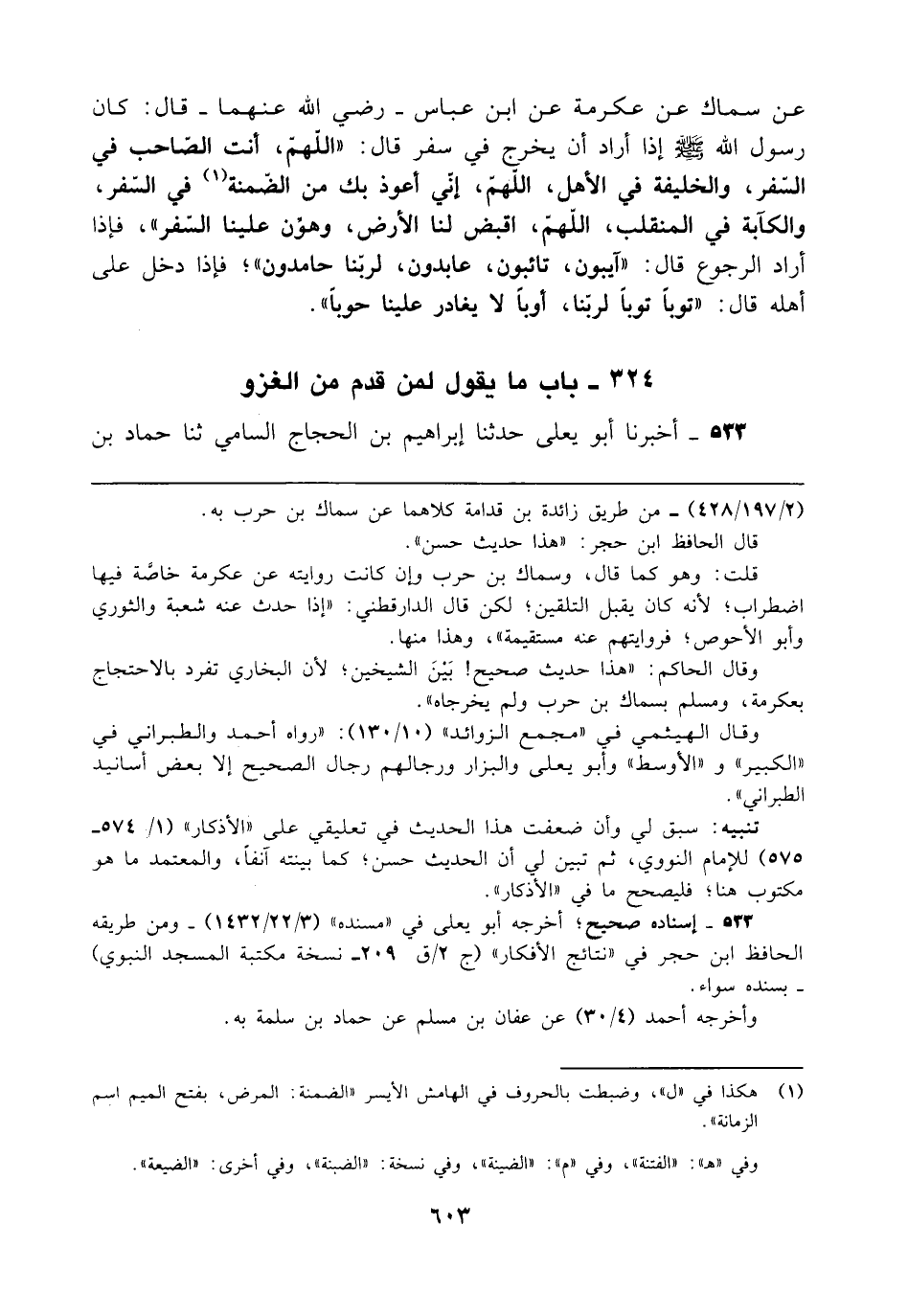 عن سماك عن عكرمة عن ابن عباس - رضي الله عنهما - قال: كان رسول الله - صلى الله عليه وسلم - إذا أراد أن يخرج في سفر قال: "اللهم، أنت الصّاحب في السّفر، والخليفة في الأهل، اللهم، إني أعوذ بك من الضّمنة (¬1) في السّفر، والكآبة في المنقلب، اللهمّ، اقبض لنا الأرض، وهون علينا السفر"، فإذا أراد الرجوع قال: "آيبون، تائبون، عابدون، لربّنا حامدون"؛ فإذا دخل على أهله قال: "توبًا توبًا لربّنا، أوبًا لا يغادر علينا حوبًا".