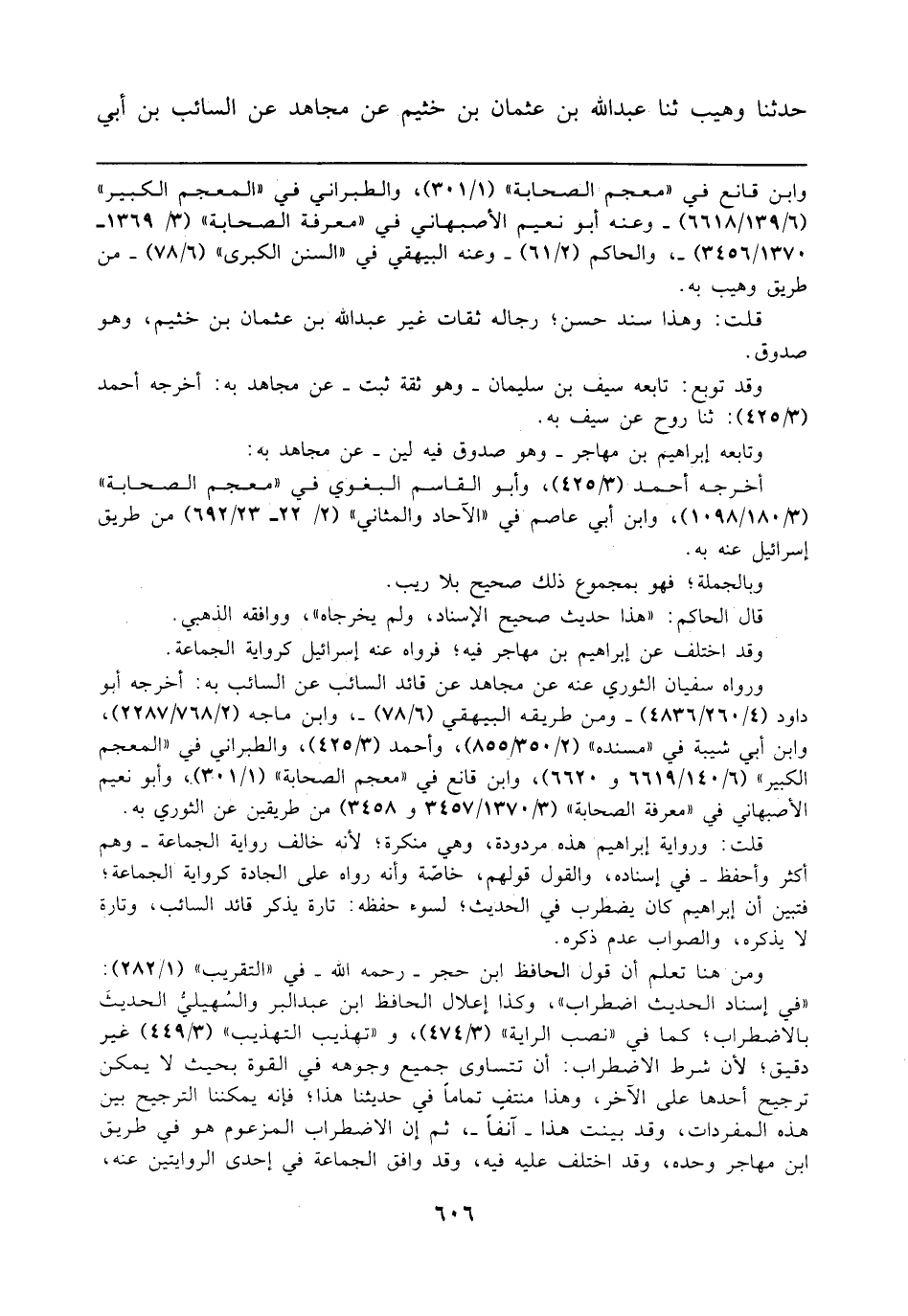 قلت: ورواية إبراهيم هذه مردودة، وهي منكرة؛ لأنه خالف رواية الجماعة -وهم أكثر وأحفظ- في إسناده، والقول قولهم، خاصة وأنه رواه على الجادة كرواية الجماعة؛ فتبين أن إبراهيم كان يضطرب في الحديث؛ لسوء حفظه: تارة يذكر قائد السائب، وتارة لا يذكره، والصواب عدم ذكره.