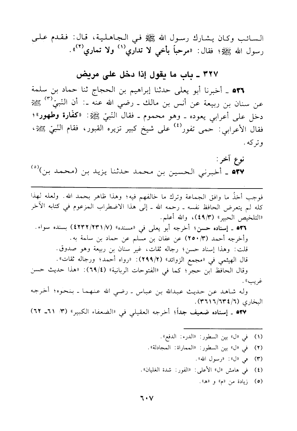 536 - أخبرنا أبو يعلى حدثنا إبراهيم بن الحجاج ثنا حماد بن سلمة عن سنان بن ربيعة عن أنس بن مالك - رضي الله عنه -: أن النبي (¬3) - صلى الله عليه وسلم - دخل على أعرابي يعوده -وهو محموم- فقال النبي - صلى الله عليه وسلم -: "كفّارة وطهور"؛ فقال الأعرابي: حمى تفور (¬4) على شيخ كبير تزيره القبور، فقام النبي - صلى الله عليه وسلم -، وتركه.