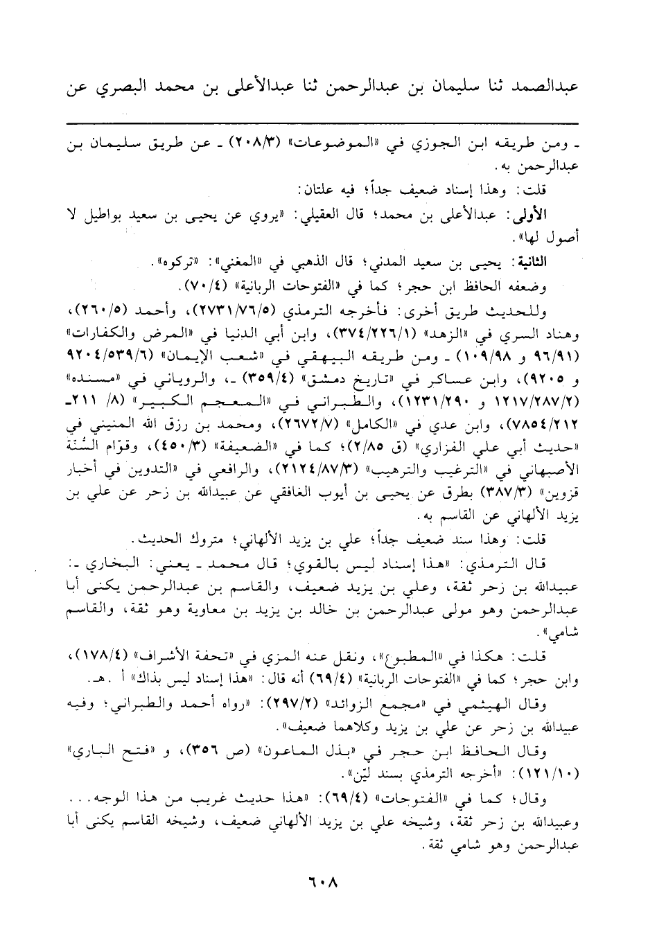 وقال؛ كما في "الفتوحات" (4/ 69): "هذا حديث غريب من هذا الوجه ... وعبيد الله بن زحر ثقة، وشيخه علي بن يزيد الألهاني ضعيف، وشيخه القاسم يكنى أبا عبد الرحمن وهو شامي ثقة.