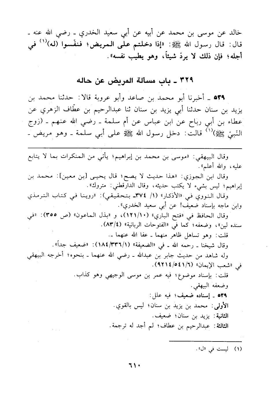 خالد عن موسى بن محمد عن أبيه عن أبي سعيد الخدري - رضي الله عنه - قال: قال رسول الله - صلى الله عليه وسلم -: "إذا دخلتم على المريض؛ فنفسوا (له) (¬1) في أجله؛ فإن ذلك لا يردّ شيئًا، وهو يطيب نفسه".