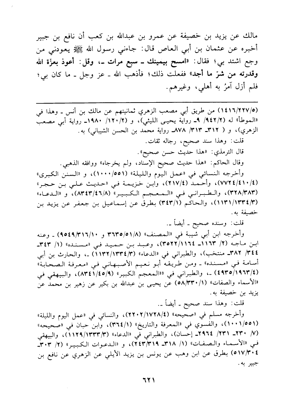 مالك عن يزيد بن خصيفة عن عمرو بن عبد الله بن كعب أن نافع بن جبير أخبره عن عثمان بن أبي العاص قال: جاءني رسول الله - صلى الله عليه وسلم - يعودني من وجع اشتد بي؛ فقال: "امسح بيمينك -سبع مرات-، وقل: أعوذ بعزّة الله وقدرته من شرّ ما أجد" ففعلت ذلك؛ فأذهب الله - عز وجل - ما كان بي؛ فلم أزل آمرُ به أهلي، وغيرهم.