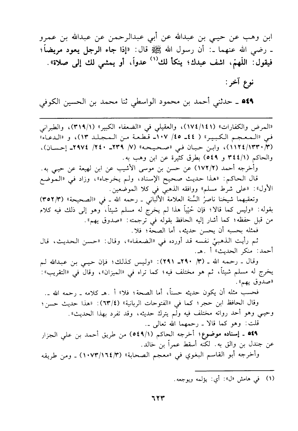 ابن وهب عن حيي بن عبد الله عن أبي عبد الرحمن عن عبد الله بن عمرو - رضي الله عنهما -: أن رسول الله - صلى الله عليه وسلم - قال: "إذا جاء الرجل يعود مريضًا؛ فيقول: اللهم، اشف عبدك؛ ينكأ لك (¬1) عدوًا، أو يمشي لك إلى صلاة".