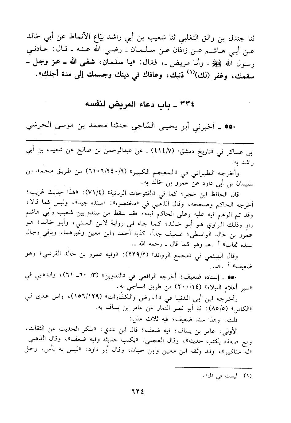 ثنا جندل بن والق التغلبي ثنا شعيب بن أبي راشد بياع الأنماط عن أبي خالد عن أبي هاشم عن زاذان عن سلمان - رضي الله عنه - قال: عادني رسول الله (صلى الله عليه وسلم) -وأنا مريض-، فقال: "يا سلمان، شفى الله - عز وجل - سقمك، وغفر (لك) (¬1) ذنبك، وعافاك في دينك وجسمك إلى مدة أجلك".