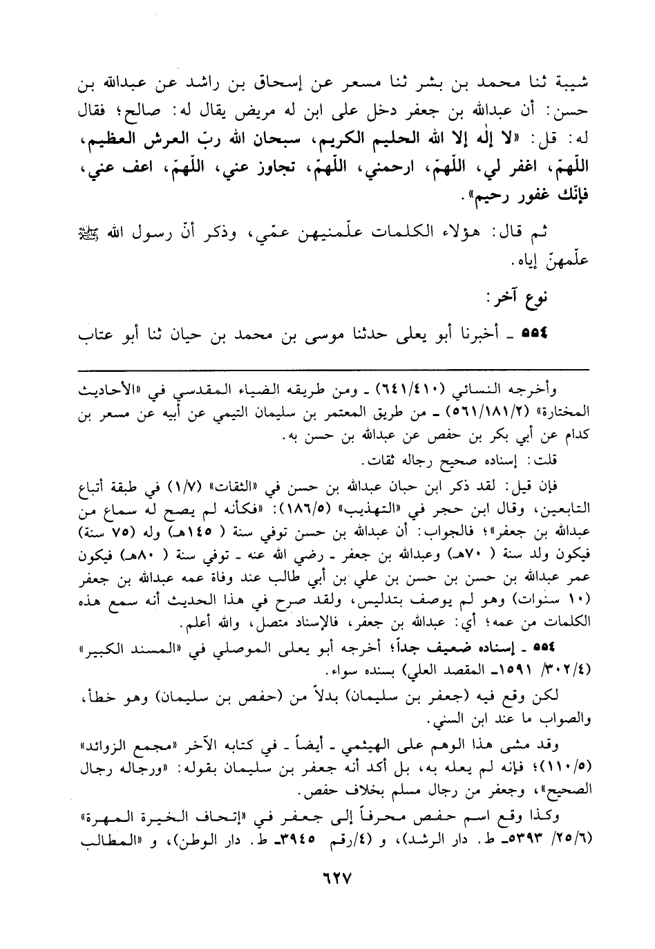 شيبة ثنا محمد بن بشر ثنا مسعر عن إسحاق بن راشد عن عبد الله بن حسن: أن عبد الله بن جعفر دخل على ابن له مريض يقال له: صالح؛ فقال له: قل: "لا إله إلا الله الحليم الكريم، سبحان الله ربّ العرش العظيم، اللهمّ، اغفر لي، اللهم، ارحمني، اللهم، تجاوز عني، اللهم، اعف عني، فإنك غفور رحيم".