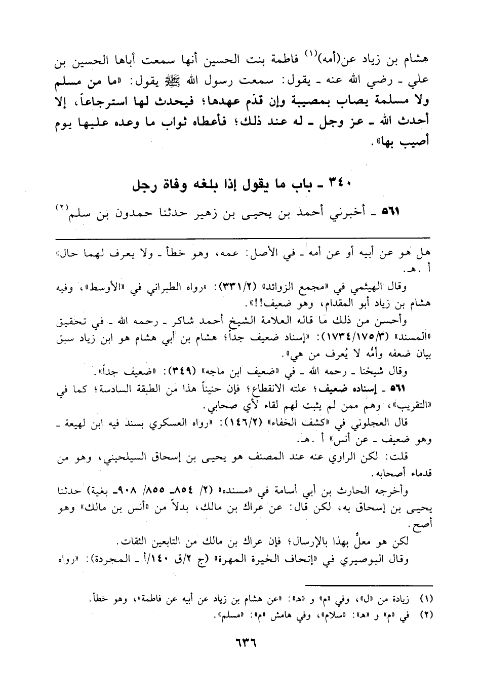 هشام بن زياد عن (أمه) (¬1) فاطمة بنت الحسين أنها سمعت أباها الحسين بن علي - رضي الله عنه - يقول: سمعت رسول الله - صلى الله عليه وسلم - يقول: "ما من مسلم ولا مسلمة يصاب بمصيبة وإن قدّم عهدها؛ فيحدث لها استرجاعًا، إلا أحدث الله - عز وجل - له عند ذلك؛ فأعطاه ثواب ما وعده عليها يوم أصيب بها".