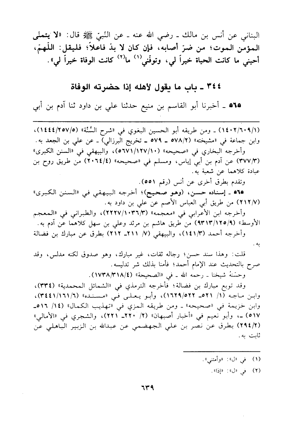البناني عن أنس بن مالك - رضي الله عنه - عن النبي - صلى الله عليه وسلم - قال: "لا يتمنى المؤمن الموت؛ من ضرّ أصابه، فإن كان لا بد فاعلا؛ فليقل: اللهمّ، أحيني ما كانت الحياة خيرًا لي، وتوفني (¬1) ما (¬2) كانت الوفاة خيرًا لي".