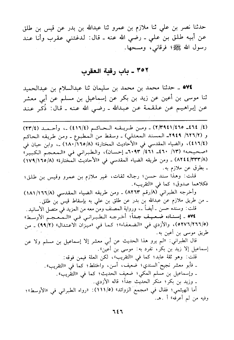 حدثنا نصر بن علي ثنا ملازم بن عمرو ثنا عبد الله بن بدر عن قيس بن طلق عن أبيه طلق بن علي - رضي الله عنه - قال: لدغتني عقرب وأنا عند رسول الله - صلى الله عليه وسلم -؛ فرقاني، ومسحها.