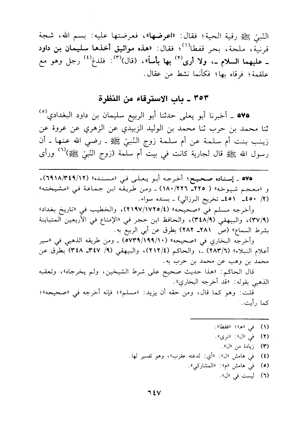 575 - أخبرنا أبو يعلى حدثنا أبو الربيع سليمان بن داود البغدادي (¬5) ثنا محمد بن حرب ثنا محمد بن الوليد الزبيدي عن الزهري عن عروة عن زينب بنت أم سلمة عن أم سلمة زوج النبي - صلى الله عليه وسلم - (رضي الله عنها) أن رسول الله - صلى الله عليه وسلم - قال لجارية كانت في بيت أم سلمة (زوج النبي - صلى الله عليه وسلم -) (¬6) ورأى