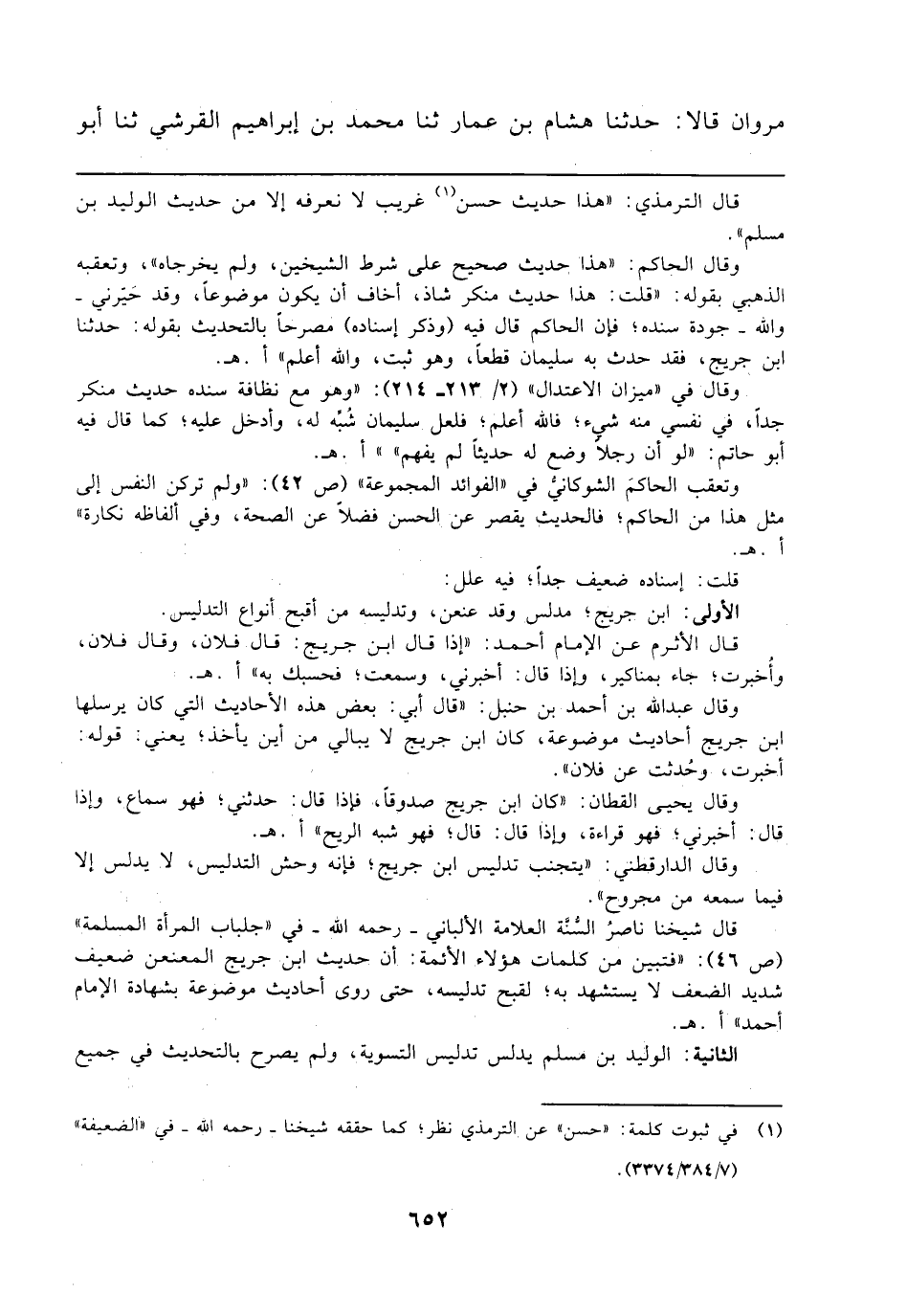 قال شيخنا ناصرُ السُّنَّة العلامة الألباني - رحمه الله - في "جلباب المرأة المسلمة" (ص 46): "فتبين من كلمات هؤلاء الأئمة: أن حديث ابن جريج المعنعن ضعيف شديد الضعف لا يستشهد به؛ لقبح تدليسه، حتى روى أحاديث موضوعة بشهادة الإمام أحمد" أ. هـ.